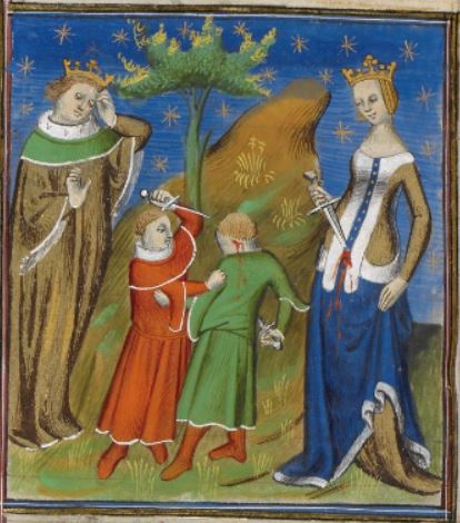 This illumination depicts the story of Jocasta and Oedipus. Jocasta is depicted on the right side of the image stabbing herself in the abdomen, while her husband Oedipus is on the left side of the image looking horrified. Jocasta is stabbing herself because she found out that her husband, Oedipus, is her son. The two smaller figures in the centre of the image are Eteocles and Polynices, the sons of Jocasta and Oedipus. They kill each other in war, which is why they are depicted stabbing one another in this illustration.