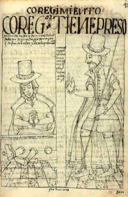 This image is illustrated in a chapter that discusses and criticizes the government and society in Spanish conquered Peru. This image depicts a Spanish Corregidor [Magistrate] on the right side of the engraving dressed in traditional European clothing. He is illustrated looking over to the man on the left side of the image who has his hands and feet shackles and his legs through stocks. This man’s name is Don Cristobal de Leon, and the author explains that he was imprisoned and tortured by the Corregidor for refusing to give him indigenous peoples for laborious work such as, transporting goods, weaving, and spinning yarn. There is script written in the centre of the image which is the dialogue of the Correigedor. It reads, warcuscayqui galera-man carcoscayqui [I’ll send you to the galleys]. The writing on the stocks is Don Cristobal’s dialogue which reads, runarayco cay sepo-pi nacarisac [for my people I shall suffer in these stocks].