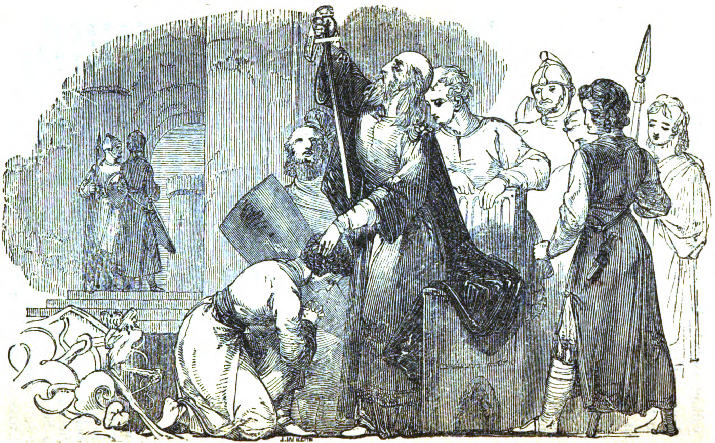 Diego Lainez grants his sword to his son Rodrigo, surrounded by his other sons. Diego had been grievously insulted by Don Lozano Gomez, and Rodrigo, though still very young, was eager to avenge him while his other sons were not. He uses his father’s sword to duel and kill Lozano over the offence.