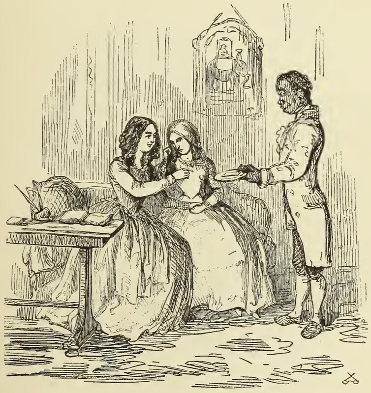 Sambo, standing on the right, presents a platter on which rests a letter for Miss Amelia Sedley from her brother. Amelia, who is reaching for the letter, sits on the sofa next to Rebecca Sharp. Amelia looks concerned, while Becky looks irritated. On the wall behind them is a portrait of the man in question atop an elephant, and on the table to the left of the illustration lies an open book and inkwell with a pen and quill.