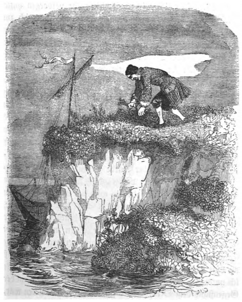Here we see Gulliver’s arrival on Balnibarbi, the continent underneath the flying island of Laputa. After sailing for several days, he sees land. He sailed around for several hours to find the best place to come inland, and after finding a creek, he arrives on shore. He then prepared his food by making a fire, seen in this image. His small boat is visible behind the cliff. After eating, he found a small cave where he slept and stored the rest of his provisions. The same image appears in the 1839 Krabbe edition.