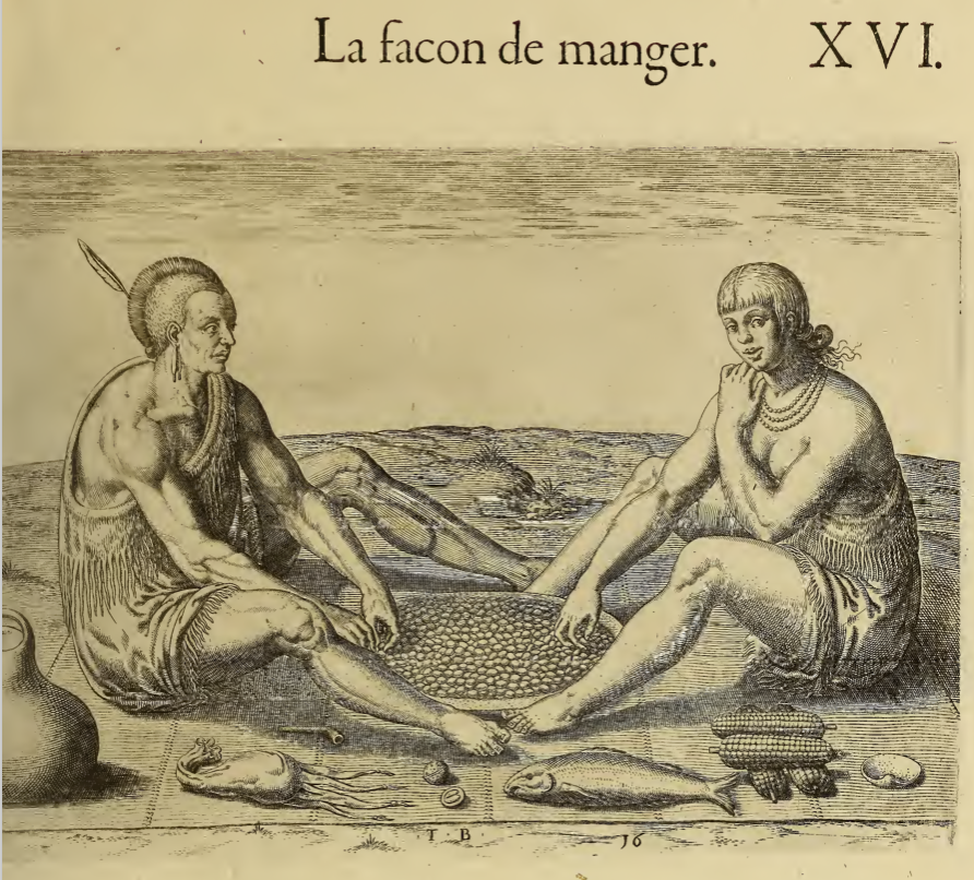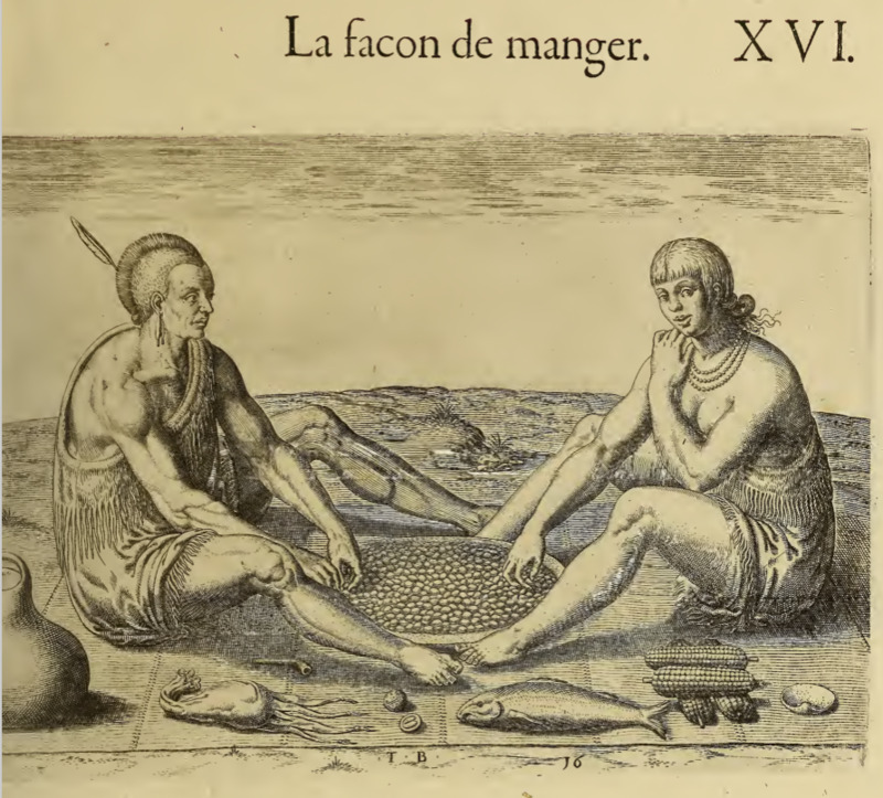 Two Indigenous people are shown sharing a meal. A man sits on the left, and a woman on the right. They sit on a mat on the ground. A large dish with food is between them, and around them are a jug, a pipe, some nuts, a fish, some cobs of corn, and other objects. The man wears a fringed garment draped around his body and over one shoulder and a single feather in his hair. The woman wears a similar fringed garment draped over one shoulder and two strands of beads around her neck.
