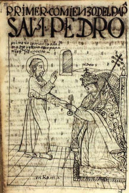 This illustration depicts Jesus Christ on the right side of the image as he hands the keys to the kingdom of Heaven to Peter, traditionally known to be the first Pope of Rome. Peter’s name, written in Spanish as. Pedro, is written above his head in order to identify him. He is wearing pontifical attire and holding a staff with three horizontal bars, which symbolizes the Pontiff. The words en Roma, are written at the bottom of the image to indicate that this is taking place in Rome.