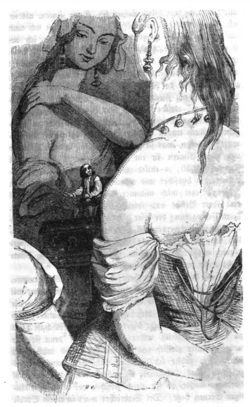 The maids of honour of the Queen of Brobdingnag entertain themselves looking at Gulliver. In the image we see two women with their shoulders exposed, partially undressed. Their hair is loose and the woman on the right has her corset unlaced. They wear earrings and necklaces. Gulliver sits in the centre looking up at the women. The scene appears when Gulliver describes the women on Brobdingnag, talking about their dress, appearances, and scent. The same image appears in the 1843 Krabbe edition.