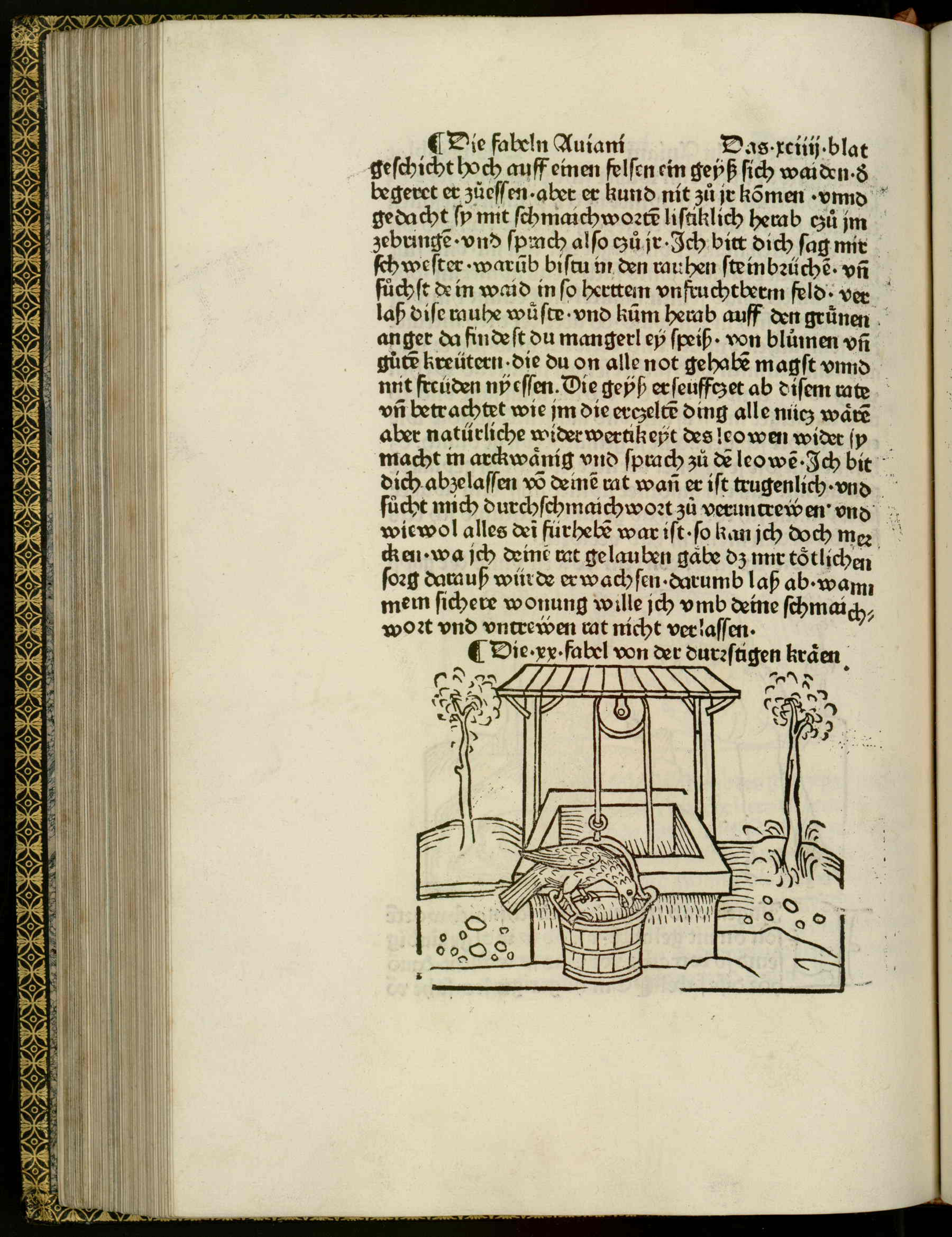 - The image has a bird drinking from a water bucket. The water bucket contains water from the well in the background.
