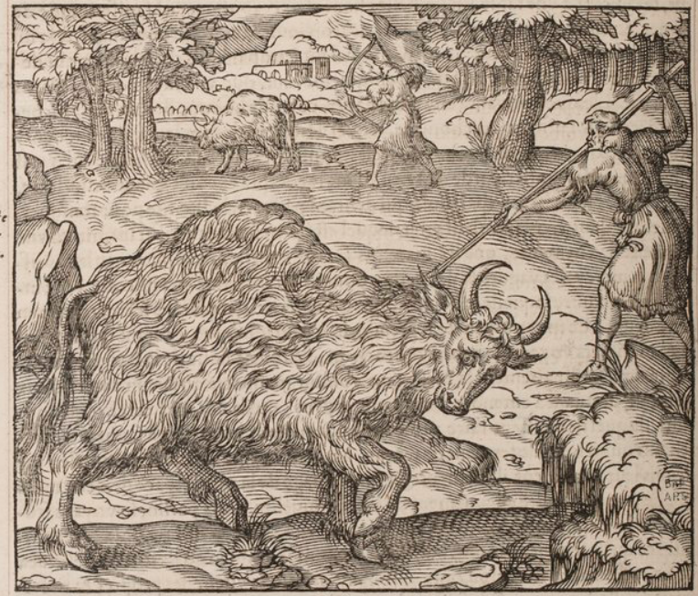 Two Indigenous people hunt large animals in Florida. The animals, which are likely bison, have long shaggy fur and curved horns. The two men wear garments made from the animals’ pelts, which protect them from cold (according to the text), and use a spear and a bow and arrow to hunt the animals. Thevet mentions in the text that ‘Buttol’ is the Indigenous peoples’ name for the animals. This image is identical to one found on page 1007 verso of Paris, 1575 (l’Huillier).