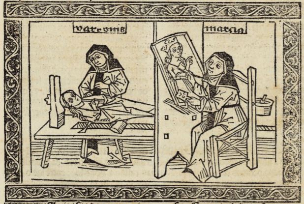 Marcia, a Roman woman who remained a virgin her entire life, is depicted on the right side of the engraving painting a portrait. Boccaccio explains that Marcia is worthy of renown for her chastity and for her painting and sculpting abilities. She is known to have mostly painted and sculpted figures of women, which is why there is a portrait of a woman wearing a crown in her painting. The left side of the engraving depicts Marcia sculpting a figure of a woman. Her sculpting tools are illustrated on the table in front of her. Marcia’s name is engraved at the top of the engraving on the right side to identify her. The name Varronis is engraved at the top on the leftt side of the engraving, which refers to her father, Varro.
