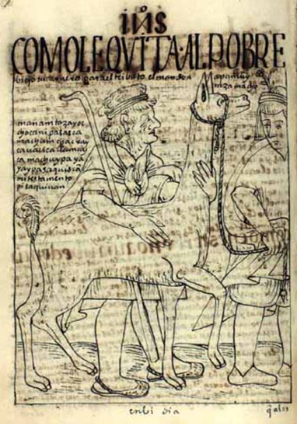 This image depicts a native official trying to confiscate an old native man’s llama for tribute. The old man is depicted holding on to his llama’s back with his right hand and the llama’s neck with his left hand as he tries to prevent the official from taking it. He has tears running down his face. The official is standing on the right side of the image holding the rope tied to the llama as he tries to take it away. The old man’s dialogue written on the left side of the image reads, Manam tazayoccho cani. Pasasca machum. Chacrayca, uacica, llamayca machuypa yayaypa saquiscanmi. Testamentopi saquiuan [I am not taxable. I am already old. The fields, my house and my llama are what my father left me, he left me these things in his will].