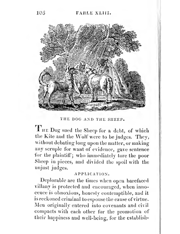- A dog stands to the left of a sheep. Both of them are facing away from the viewer and are looking at a wolf and a vulture (kite) who are wearing robes and sitting on the ground. They sit in front of a large tree. The dog stands straight and upright and has a tail curled to the right.