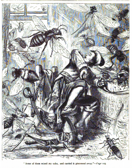Here giant wasps from Brobdingnag attacked Gulliver. Glumdalclitch gave Gulliver a piece of cake, however the wasps saw it and attacked Gulliver, trying to get the cake. Gulliver fought them off using his sword and brought some of the stingers home to England with him.
