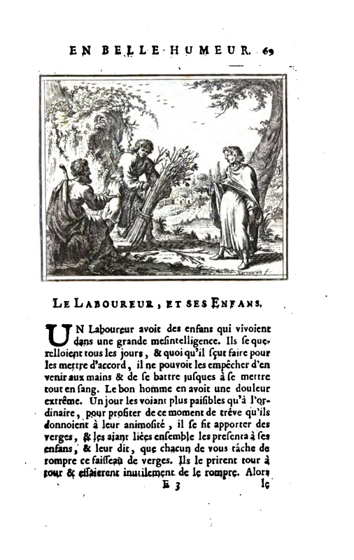 A farmer had children who lived in great harmony. They quarreled every day, and whatever he could do to bring them to an agreement, he could not prevent them from coming to blows and fighting until they were all in a rage. The good man was in extreme pain. One day seeing them more peaceful than usual, to take advantage of this moment of trepidation that they gave to their animosity, he brought some rods, and having tied them together presented them to his children, and said to them, that each of you try to break this bundle of rods. they took it in turn and tried intuitively to break it.
