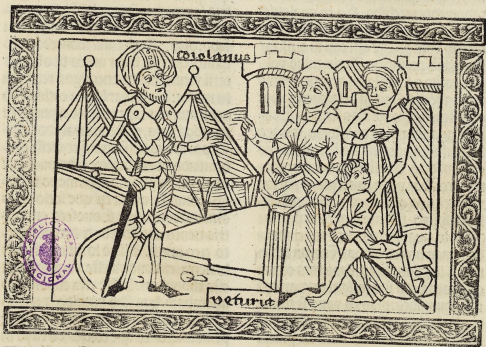 An old noble Roman woman named Veturia is depicted on the right side of the engraving with her daughter-in law and grandchild beside her. We know this figure is Veturia as her name is engraved below her feet. She is illustrated pointing at the man on the left side of the engraving. This man is her son, Coriolanus (his name is engraved above his head). Boccaccio explains that after Coriolanus had been exiled from Rome for neglecting the plebian class, he planned an attack on Rome. Veturia, with the help of her daughter-in-law (Volumnia) and grandchild, went to speak with Coriolanus at his camp and convinced him to not go through with the attack. Boccaccio explains that he decided to write on Veturia for her honour as a mother and a woman.