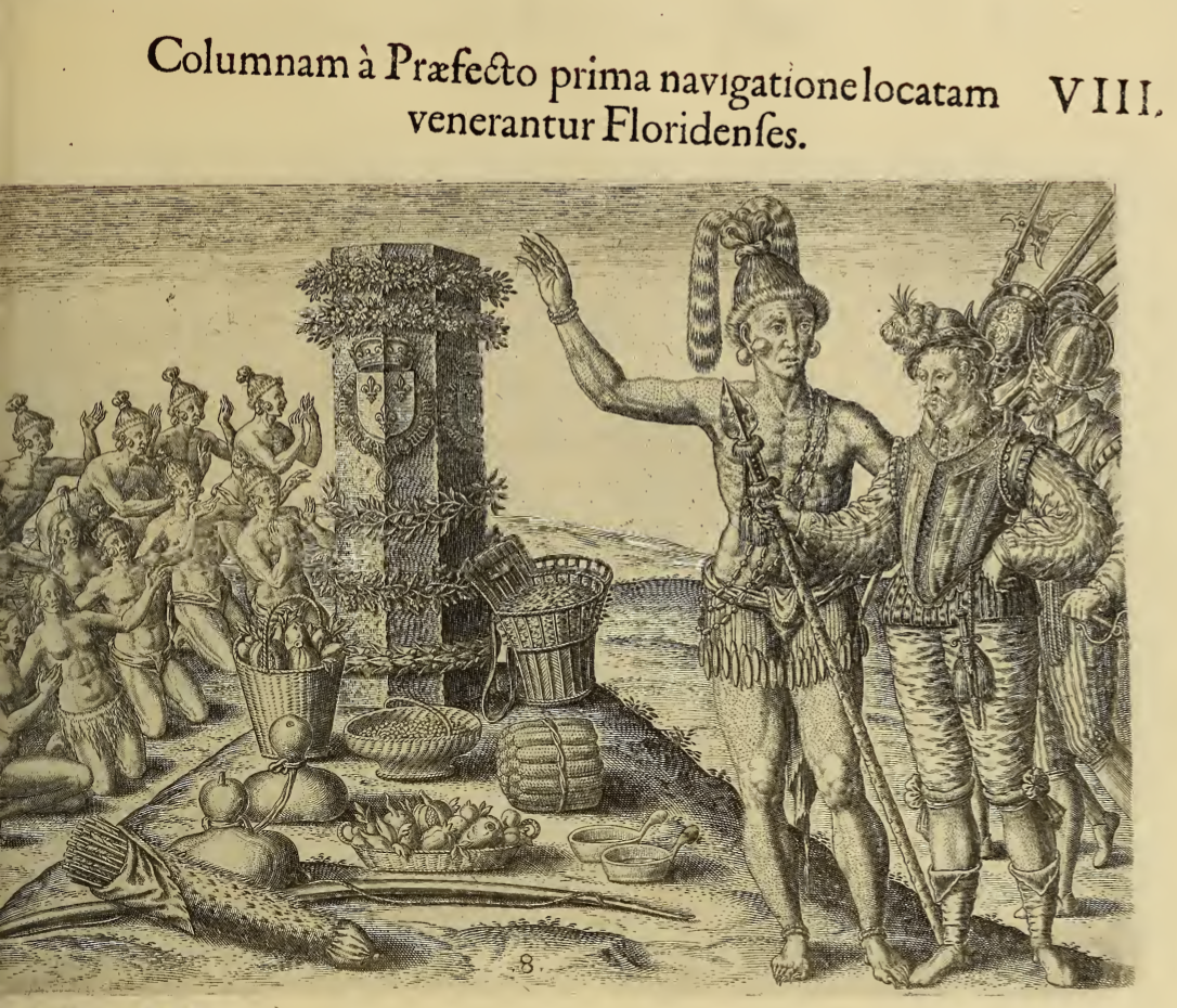 The monument erected by Jean Ribault during the voyage of 1562 is shown. There are various items on the ground around the monument, including a bow and quiver of arrows, baskets of foodstuffs, and other containers. In the foreground, an Indigenous man stands beside a colonist and gestures to the monument. The Indigenous man wears a headdress with racoon tails, a garment around his waist, a decorative chain of beads across his body, and large earrings. René de Laudonnière stands beside him. Behind the two men are several other colonists. On the left of the monument a group of Indigenous people are shown kneeling, appearing to worship the monument.