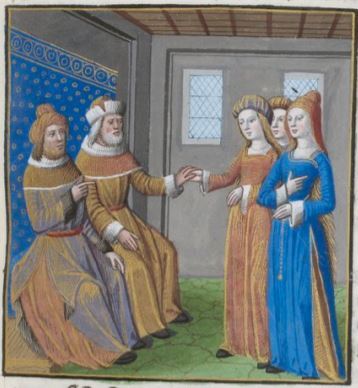 This illustration depicts two men of the Roman Senate sitting on the left side of the image. One man is illustrated pointing at the women in front of him, and the other man is depicted holding hands with one of the women. The women illustrated in the image are some of the most chaste women in all of Rome. After a statue to Venus Verticordia was erected, the Senate oversaw choosing one out of several women to consecrate the statue. The woman that they chose was Sulpicia, wife of Fulvius Flaccus and the most chaste woman in Rome. Sulpicia is most likely the woman who is holding hands with one of the Senate as she was the one chosen to consecrate the statue.