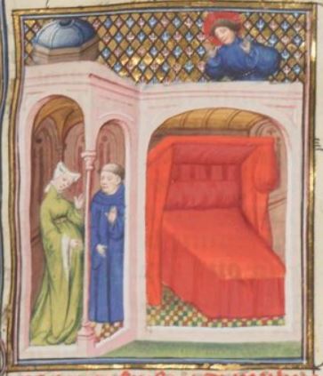 This illumination depicts a Roman woman named Paulina speaking with a priest on the left side of the image. Paulina was a chaste and devout woman and is renowned for her naivety by being tricked into losing her virtue. A man named Mundus (who is depicted hiding above the bed on the right side of the image) had fallen in love with Paulina and devised a plan to trick her into having relations with him. He bribed a priest to tell Paulina that if she stayed the night at the temple, the Egyptian God Anubis would come to her in her sleep. She believed this deception, and when she slept at the temple, Mundus disguised himself as Anubis and tricked Paulina into having intercourse with him. When Paulina realized she was deceived, her husband went to the emperor and had Mundus exiled. The priest of the temple was tortured as his punishment.