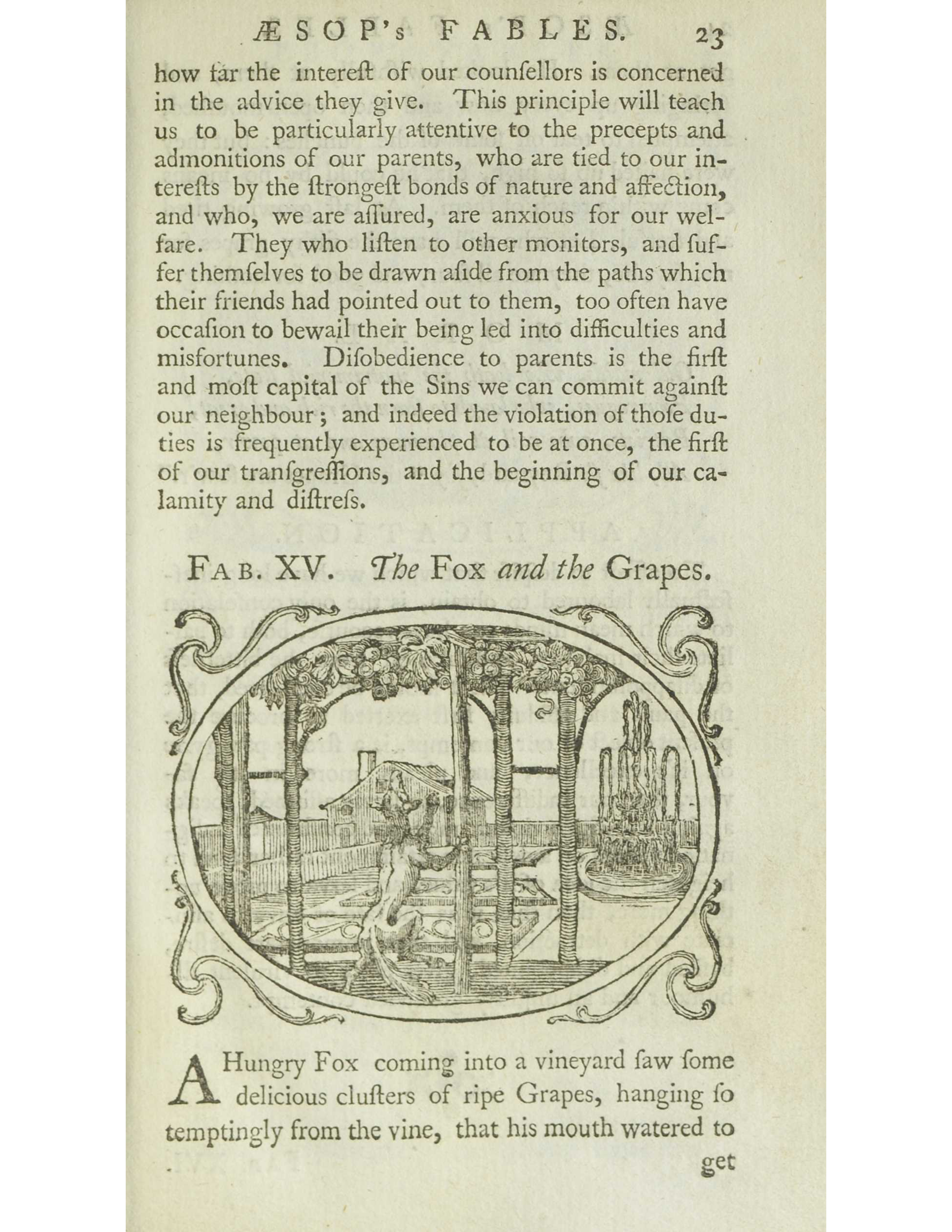 There is a fox standing on his hind legs against a tree of grapes. The tops of the trees are very full of grapes and some vines can be seen near the tops of the trees. The fox’s mouth is open while it stands under the tree. There are three rectangular forms on the ground, in the background of the image, on the left-hand side. On the right side, there is a functioning water fountain. The trees have a different surface under them than the fountain area, beyond the trees do. A house can be seen in the distance of the left side of the picture. The house has a chimney and is in an fenced in area. The fountain and rectangular objects are in the fenced in area as well.