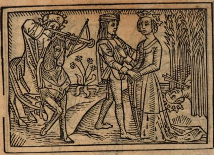 When Cephalus was told that his wife (Procris) would abandon him in exchange for money and treasures, Cephalus began testing his wife. Cephalus would disguise himself and offer her gold and treasures in exchange for her love. This scene is depicted on the right side of the engraving. Procris rejected the disguised Cephalus multiple times, however, she eventually accepted his treasures. In this scene she is holding his hand and looking at him lovingly. Procris ended up regretting what she had done to her husband. To punish herself, Procris went to live in the woods. Cephalus had been hunting one day and had mistaken his wife for an animal and shot her. Procris is visible behind the grass in the background of the engraving while Cephalus is depicted with a cross bow in his hands after shooting her.