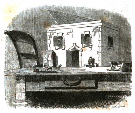 Here we see the exterior of Gulliver’s house in Brobdingnag. The house is a box that is sixteen square feet and twelve feet high. It was built to resemble the style of the houses in London in the early eighteenth century. There is a large front door, with two arched windows on the front and a square window on the side. The roof comes off so the giants could see Gulliver more easily. The house is still under construction in this image, as the front door is not attached, and Gulliver’s furniture is outside. Gulliver’s sleigh bed, writing desk, and chairs are on the table, outside his house. Gulliver sits on a bench outside his house. His house sits on a table with a drawer and a chair. The same image appears in the 1843 Krabbe edition.