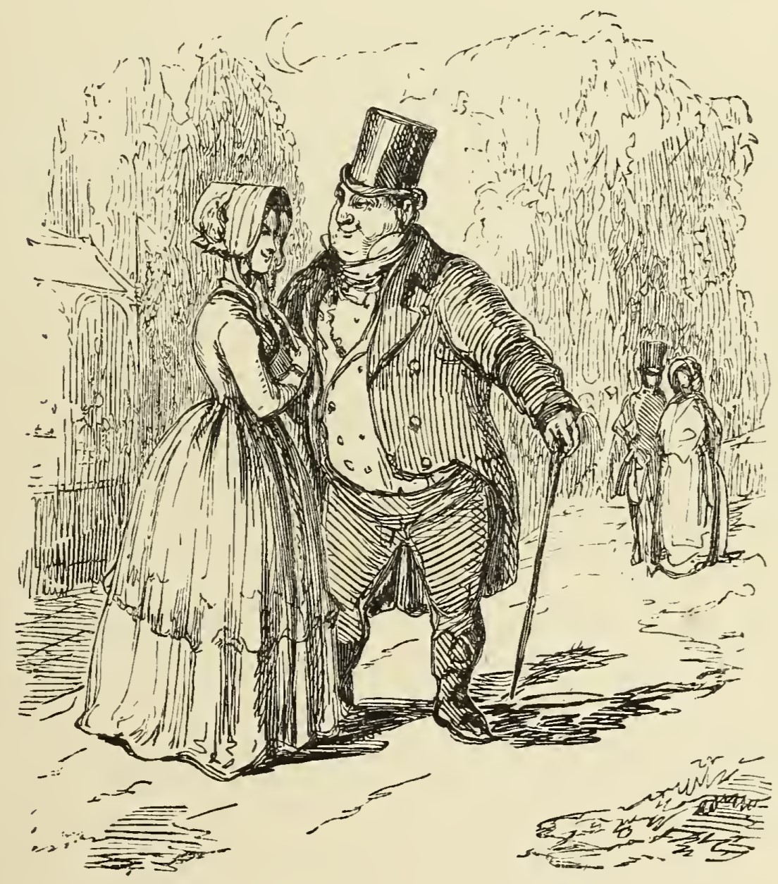 - Rebecca Sharp, wearing a bonnet, holds onto the arm of Joseph Sedley, who is wearing a top hat and carrying a cane. The two figures are standing beneath a crescent moon. In the background is another couple, possibly George Osborne and Amelia Sedley, possibly a pair of strangers.