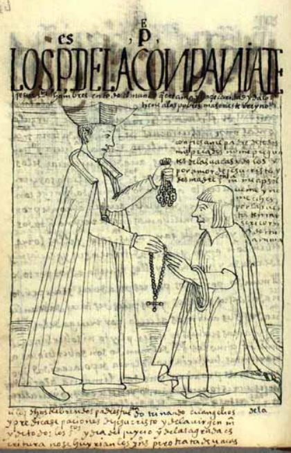 This image is illustrated in a chapter that discusses the Christian priests in the colonial government in Peru. The image depicts a Jesuit priest who the author praises for keeping true to his religious duties and being charitable and loving. The author previously criticized many priests for having abused their powers against the indigenous peoples of Peru. The priest is illustrated standing in front of a kneeling indigenous man whose hands are together in prayer as he makes a confession. The priest is handing a rosary to the man. There are words of dialogue written above the indigenous man which reads, Confiesame, padre, de todos mis pecados. No me preguntes de las uacas, ydolos, y por amor de Jesucristo y de s[u] madre Santa María, me apsolueme y no me eches por la puerta. Ten misericordia de mi ánima [I confess father, of all my sins, Do not ask me about the idol huaca, and for the love of Jesus Christ and your mother Saint Mary, support me and do not throw me out the door, have mercy on my soul]. The large caption at the bottom of the image reads, ci los dichos rrebrendos padres fuesen dotrinando euangelios y predicase paciones de jesucristo y de la uirgen maría y de todos los santos y día del Jjycio y de la sagrada sscritura, no se huyrían los yndios [if the said revered fathers were endowing gospels and preaching patrons of Jesus Christ and the Virgin Mary and all the saints and judgement day and sacred scriptrure, the indians would not flee].