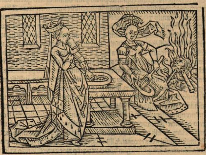 Artemisia was married to Mausolus, the king of Caria. Boccaccio explains that when he died, Artemisia was so grieved by his death that instead of putting his ashes in an urn after his cremation, she drank the ashes in order to be closer to him. The right side of the engraving depicts Artemisia cremating her husband’s body in a fire. Mausolus' head is visible in the fire. Artemisia is illustrated scooping her husband’s ashes and putting them into a bag. The left side of the engraving depicts Artemisia drinking her husband’s ashes.