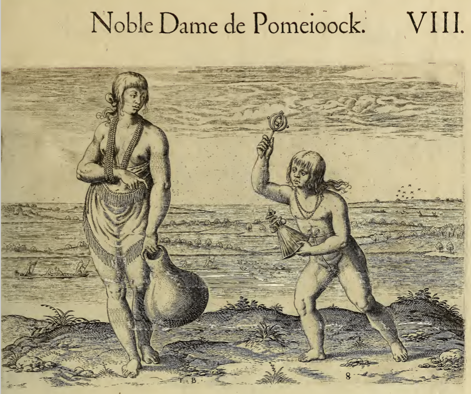 An Indigenous woman, a chief, is pictured standing on the bank of a river. Her hair is knotted at the nape of her neck, she wears several strands of beads around her neck, and her right wrist is cradled in the beads. She wears a fringed skirt around her waist and is topless and shoeless. She holds a large pot/container in her left hand. Beside her is a child, nude except for two strands of beads around their neck. The child holds a doll dressed like an English lady in one hand, and an object similar to a rattle in the other. Behind the pair, other Indigenous people are seen in canoes.
