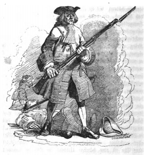 Here we see a mercenary soldier on the battlefield, holding a musket with bayonet attachment. Gulliver explains that mercenary troops were available for hire for any nation, and thus did not necessitate a patriotic army. When Swift wrote Gulliver’s Travels in 1727, mercenary troops were common, and we are just beginning to see national armies. The same image appears in the 1843 Krabbe edition.