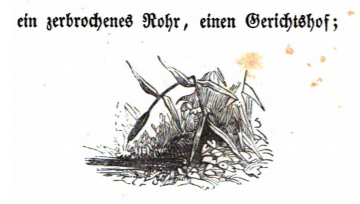 Here we see the broken stems of a reed plant. This is the code word for the Court of Justice. This image comes in a description of a conspiracy found by a professor from the Grand Academy on Balnibarbi. This idea is representing code word for terms in the conspiracy that Swift is satirizing. The professor advises that those named in the conspiracy papers be closely monitored at all times, naming specifically while they were using the bathroom, as this is when men were most thoughtful. This conspiracy is thought to be an allusion to the trial of Francis Atterbury, the bishop of Rochester for allegedly plotting with the Jacobites. Atterbury was charged with treason in 1722 and was exiled to France. The same image appears in the 1843 Krabbe edition.