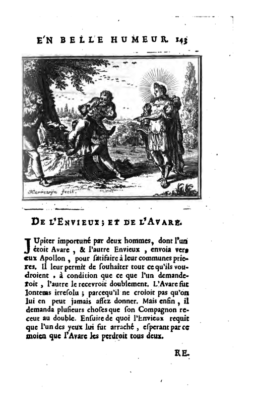 Two neighbors came before Jupiter and prayed for him to grant their desires. One was full of Greed, and the other was full of envy. So, to punish them both, Jupiter Granted that each can have whatever he wished for himself, but only on condition that his neighbour had twice as much. The greedy man prayed to have a room full of gold, but all his joy was turned to grief when he found that his neighbor had two rooms full of gold. The envious man, who could not bear to think of his neighbor having more joy than himself, prayed that one of his eyes be put out, by which means his neighbor would have both put out.