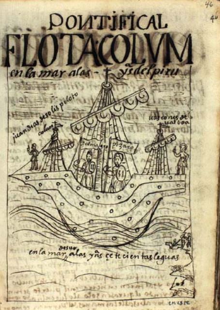 This illustration depicts the voyage of Columbus to the West Indies. The captain is depicted at the bow of the ship, with his name written above his head as Juan Dias de Solis, and the word pilot to identify his position. Beside the captain is Columbus, with his name written as, colum. The two captains of the embarkment, Don Diego de Almagro and Don Francisco Pizarro are illustrated in the centre of the ship holding flags. There is a man standing at the stern of the ship is identified as Vasco Nunes de Ualboa. There is an inscription below the ship which reads, en la mar a las yndias cetecientas leguas and translates to over the southern sea to the Indies 700 leagues.