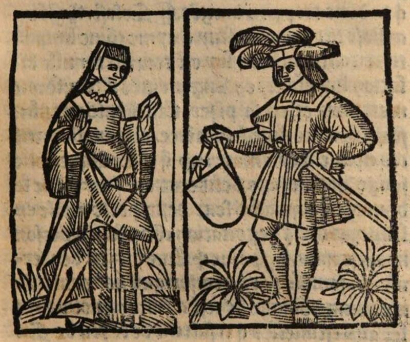 We know that the male figure on the right is Sempronio, since he is the only male character included in the third act. He is depicted holding a satchel in his right hand. Further, he is wearing a large hat and has a sword mounted on his belt. The female figure on the left is depicted wearing a robe, a veil, and a necklace. Her identity is ambiguous, since Sempronio interacts with both Celestina and Elicia in this act. Both figures are placed outside.The entire image is identical to the one found on page 58 of the text. Both the left and right panels are near carbon-copies of panels used multiple times throughout the earlier 1529 Lyon edition. However, the lower attention to detail in these illustrations makes it clear that they are reproductions and not duplicates. The artist likely referred to a copy of the 1529 edition when creating these illustrations.