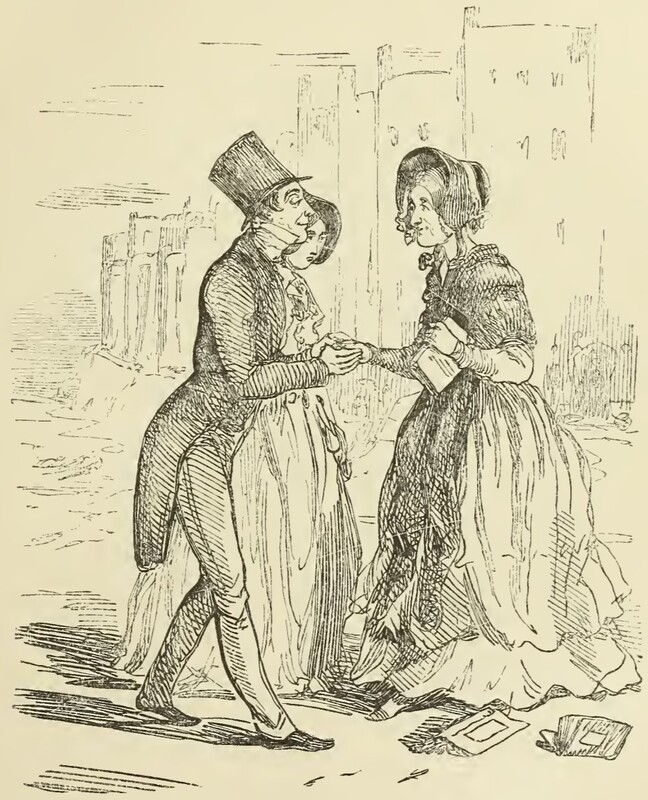 Mr. Pitt Crawley introduces Miss Briggs, his aunt’s companion, to Lady Jane Sheepshanks, his betrothed, with a smug look on his face. Miss Briggs, on her way home from the library, is holding one of her books and has dropped two others. Lady Jane is half hidden behind Mr. Crawley, looking shy.