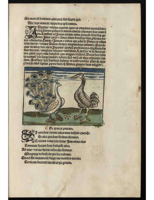 - A peacock and a crane stand outdoors looking at one another.
