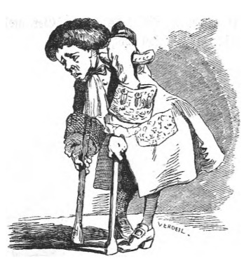 Here we see a man on crutches. This image appears when Gulliver explains European nobility and their conduct. Gulliver explains that many upper-class men hire prostitutes which causes them to contract various diseases, while they are engaged to women chosen by their family. The upper classes also tended to be incestuous, which caused children to be born with deformities and they were more likely to have weak constitutions and were frequently ill. Thus, wealthy children were often sick and weak. The same image appears in the 1839 Krabbe edition.