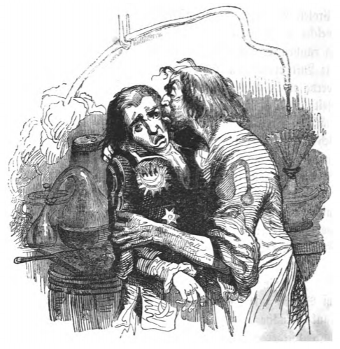 Here we see a scientist from the Grand Academy of Lagado on Balnibarbi who greeted Gulliver by embracing him. Gulliver is now dressed in the style of the locals, wearing a jacket with a motif of astronomical and mathematical symbols on it. Gulliver was unhappy to be greeted in this manner as the room had a terrible stench. This smell was caused by the scientist’s experiments. He was attempting to restore excrement to the food that was consumed. The same image appears in the 1839 Krabbe edition.