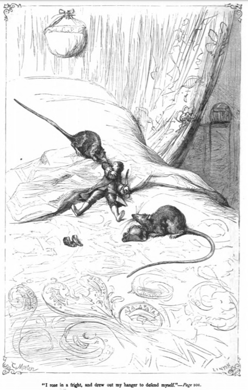 Here Gulliver defends himself from giant rats on Brobdingnag. While sleeping on the bed in Brobdingnag, two rats climbed up on the bed and began to attack Gulliver. These rats were almost the size of Gulliver. He drew his sword in self-defense and killed the rats.