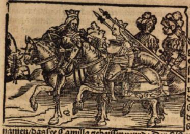 This image depicts the young Camilla, queen of the Volscians, leading an army into battle against the Trojans. She was raised in the wild by her father, King Metabus, as he was exiled from his own kingdom. Camilla grew up strong and became a great fighter and hunter as she was forced to hunt for her own food and fend for herself and her father. When old enough, she was called back to the kingdom of the Volscians to be their leader. She led her army in a war against the Trojans as allies to Turnus of the Rutuli people, where she met her final end. She is pictured riding a horse in the engraving and adorned in her armour as she is surrounded by other soldiers. She is wearing a crown to demonstrate her royal status.
