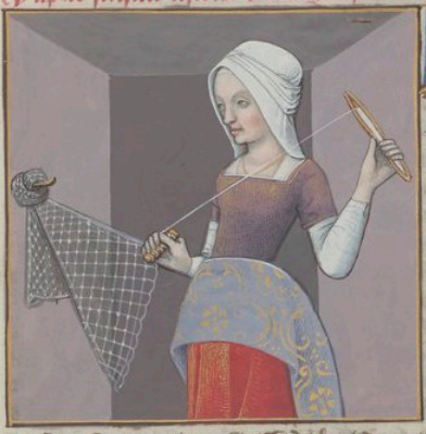 This illuminated image depicts a woman named Arachne spinning wool to make a net. Arachne is famous for having discovered the uses of woven cloth, and for being the first to think of making nets. Arachne is also known for having challenged Minerva to a weaving competition. When Arachne lost the competition, she killed herself as a result.