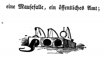 This image shows a mousetrap, which is the code word for an employment or public office. This image comes in a description of a conspiracy found by a professor from the Grand Academy on Balnibarbi. This idea is representing code word for terms in the conspiracy that Swift is satirizing. The professor advises that those named in the conspiracy papers be closely monitored at all times, naming specifically while they were using the bathroom, as this is when men were most thoughtful. This conspiracy is thought to be an allusion to the trial of Francis Atterbury, the bishop of Rochester for allegedly plotting with the Jacobites. Atterbury was charged with treason in 1722 and was exiled to France. The same image appears in the 1839 Krabbe edition.