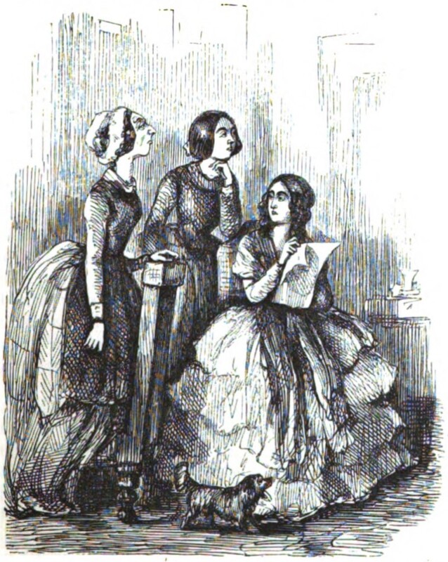 Jane and Maria Osborne and their governess, all with displeased expressions on their faces. One sister is standing with her chin on one hand. She and the governess, Miss Wirt, are looking towards the right of the picture, staring in the direction in which Amelia Sedley just left. The other sister is seated on a cushioned chair, holding a piece of cloth or paper and looking back at the others. On the floor by her side there is a small dog.