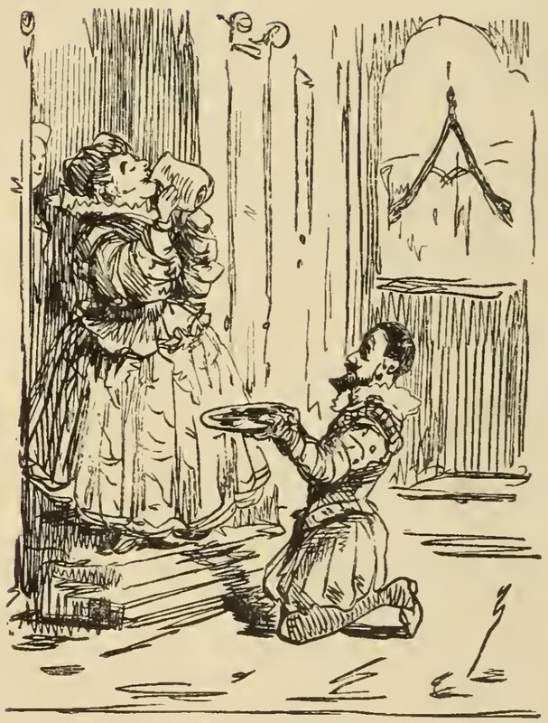 Queen Elizabeth I is depicted standing on a raised dais to the left of the image, drinking from a pitcher of beer she holds in both hands. In front of her is the ancestor of Pitt Crawley, a man with a pointed beard, kneeling and holding the platter from which the beer was taken. A slight figure of a guard can be seen behind the queen, and in the top right of the picture, the letter A from Among is seen through a window.