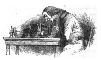 In this image Gulliver is seated at a table looking at a Lilliputian carriage. There is a woman from the court inside the carriage that Gulliver speaks to. Two men are on the edge of the table talking to each other. These men are the driver and the finance minister. They had come to inform Gulliver that he would have to leave Lilliput as it was too expensive to keep him there and feed and clothe him. The same image appears in the 1843 Krabbe edition.