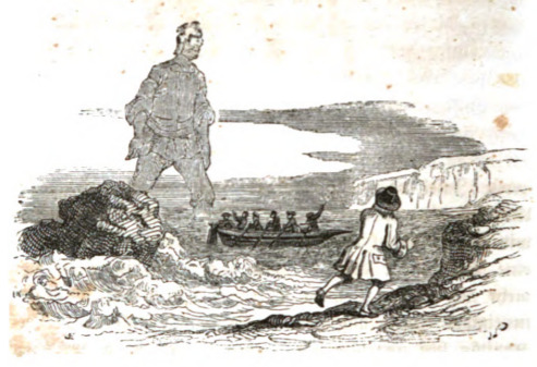 Here we see Gulliver’s crew fleeing Brobdingnag after seeing a giant, leaving Gulliver stranded. In the foreground we see Gulliver’s back as he watches the rest of the crew rowing away back to the ship. Gulliver runs along the coast, but the crew does not return to get him. Also in the foreground, we see waves crashing against a large rock, which is the same size as Gulliver. Six crew members are rowing a small rowboat and waving their arms fleeing. We see the silhouette of a giant in the distance. The giant also appears to be in the water while the crew tries to avoid him. The same image appears in the 1843 Krabbe edition.