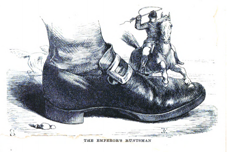 - This image shows a cavalry huntsman jumping over Gulliver’s foot. The image appears when the Lilliputians become more comfortable with Gulliver. The Huntsmen begin to use Gulliver’s foot as jump training for their horses, seen here.