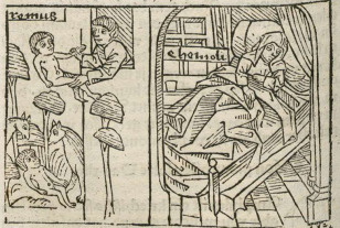 The vestal virgin Rhea Ilia is depicted on the right side of the engraving, lying in a bed with her eyes shut. We know that this is Rhea as her name is engraved beside her body. She has a saddened expression on her face as she had just given birth to twin boys named Remus and Romulus who were forced to be exposed. Boccaccio explains that as a vestal virgin, she was forbidden from becoming pregnant. Her son’s Remus and Romulus are depicted on the left side of the engraving being exposed through the window. Remus's name is engraved at the top left corner of the image. There are wolves surrounding Romulus as the mother wolf ends up raising the boys as her own. Rhea is buried alive for her punishment.