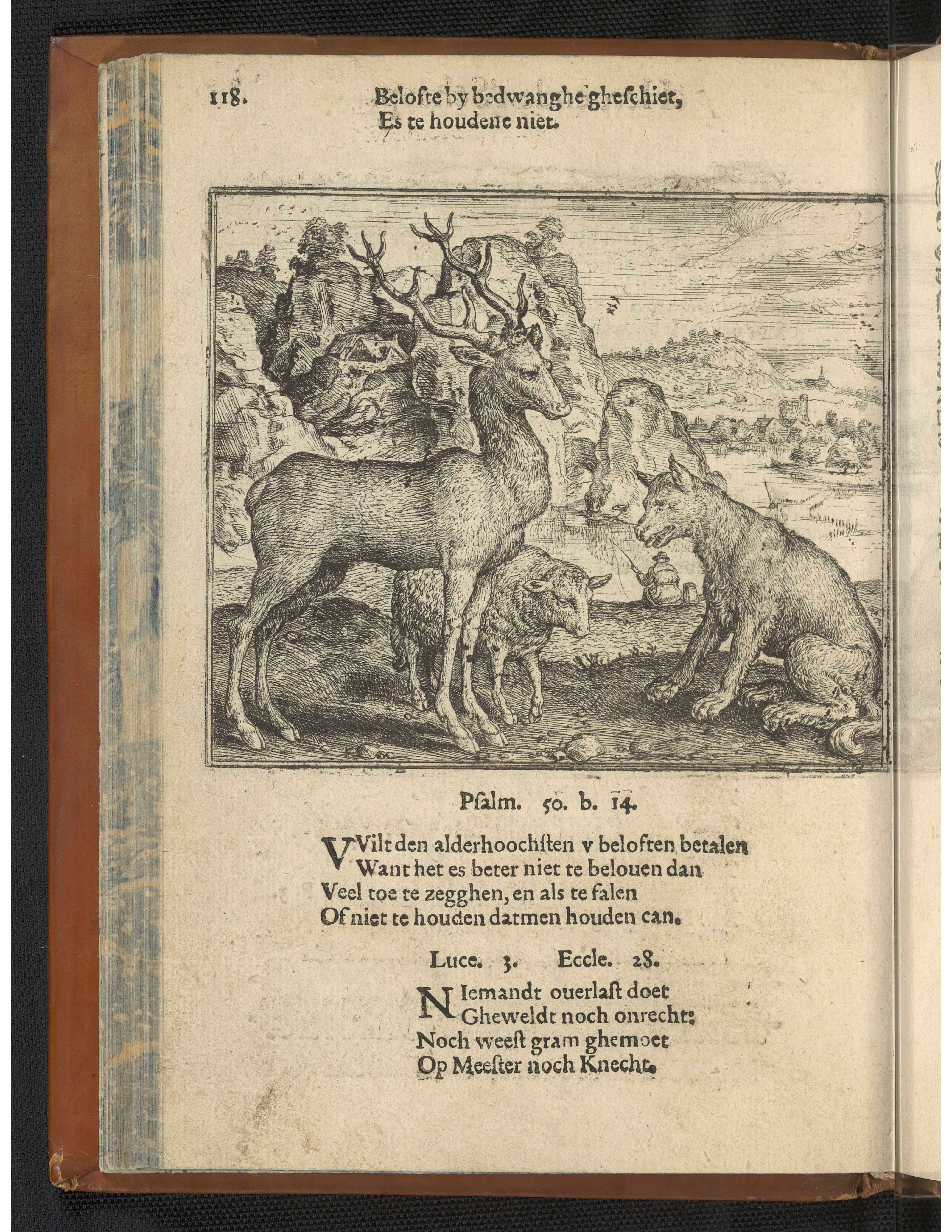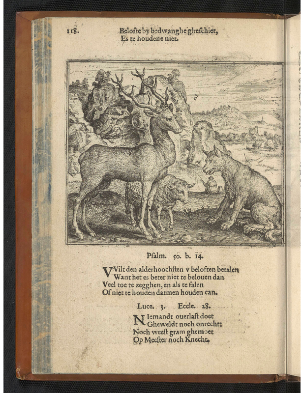 A stag and a sheep, both standing to right, looking at a fox which sits in the right foreground. A man with his back turned fishes in the centre background; Dutch letterpress on verso; illustration to Eduwaert de Dene's edition of Aesop's Fables, De Warachtighe Fabulen der Dieren (Pieter de Clerck, Bruges: 1567). c.1567