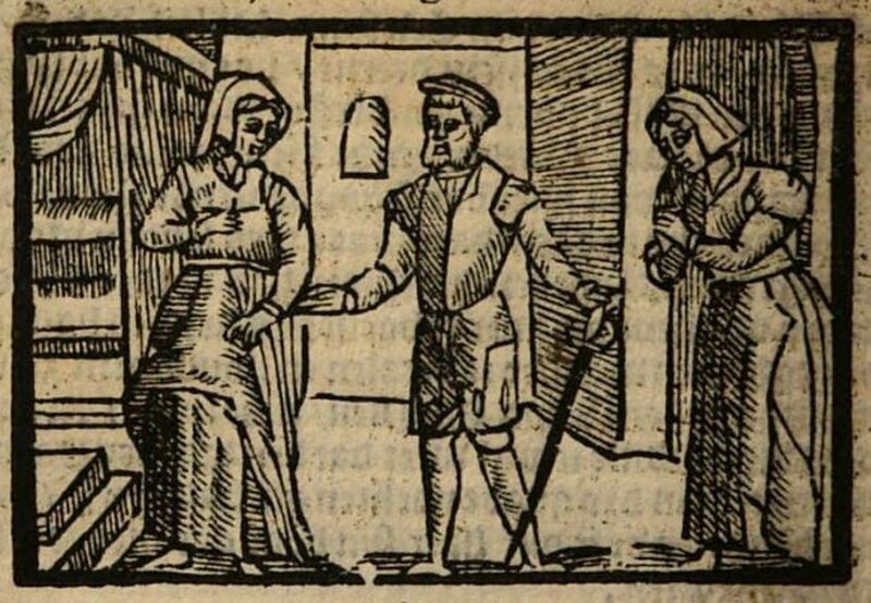 Elicia goes to Areusa’s house to inform her about the deaths of Celestina, Sempronio, and Pármeno. As she approaches the door, she overhears Areusa in a fit of rage. She realizes that Areusa is yelling at someone (Centurio), and waits for him to leave before entering. Areusa sees that Elicia is in mourning and asks her to explain why, and Elicia tells her about the deaths. With a desire to avenge the deaths that were caused as a result of Calisto's love for Melibea, they decide to ask Centurio to kill Calisto.In this image, we see Centurio reaching out toward Areusa, who appears to be pulling away from him. She is wearing a robe and a veil, while he is wearing a hat. In his left hand he is holding a sword, the tip of which is resting on the ground. To the right, we see Elicia awaiting the departure of Centurio (in the narrative she waits outside the house). She is wearing a robe and a veil, and her posture and expression convey an air of sadness.The entire image is identical to the one found on page 246 of the text