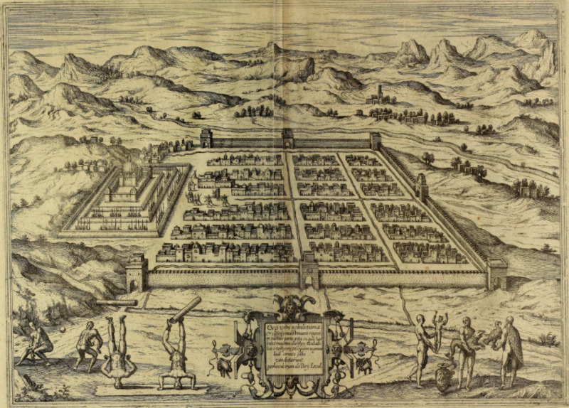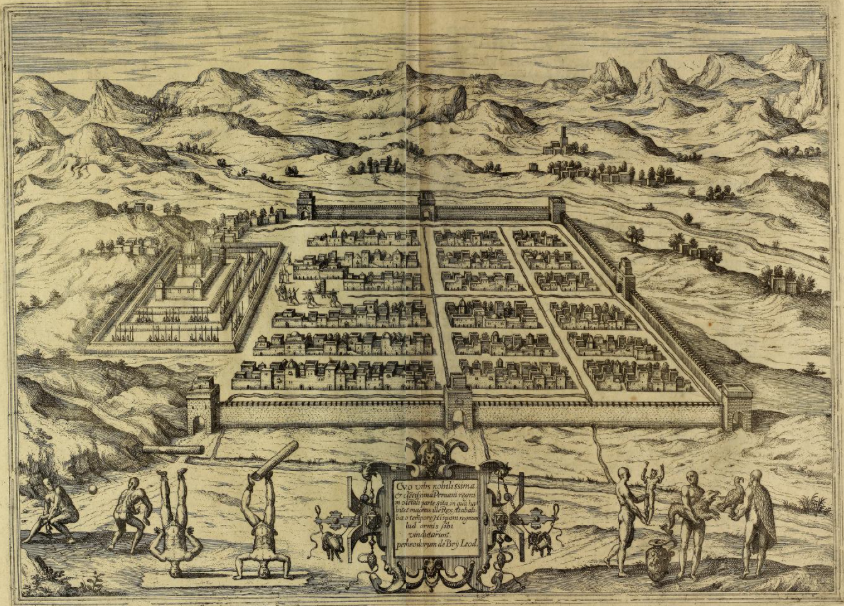 The Peruvian city of Cuzco, the capital of the Inca Empire, is shown from above. The city is laid out in an orderly fashion, with wide streets running in straight lines dividing city blocks. The city is surrounded on three sides by a square stone wall with towers built at each corner and in the middle of each wall. On the west side of the city there is a palace built atop several pyramidal layers and nestled into the hillside. There are guards armed with spears standing on each layer of ground leading up to the palace. A group of Inca people form a procession heading towards the palace. Four people carry a litter on their shoulders, upon which the Incan king Atahualpa sits. Atahualpa was the last Inca Emperor (or Sapa Inca) to officially rule before the Spanish conquistadors established their control. Along the bottom of the image, a group of Inca people on the left engage in acrobatic activities and a group on the right hold finely crafted statuettes, probably of gold. This image is identical to one found on page 6-7 of Frankfurt, 1596.