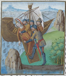 This illustration depicts a young woman named Europa being abducted by a group of panderers. Europa is depicted with a sad expression on her face as she is being lifted onto the ship that will take her to Crete. Boccaccio explains that Jupiter fell in love with Europa and ordered the panderers to abduct her from Phoenicia and take her to Crete so he can have her for himself.