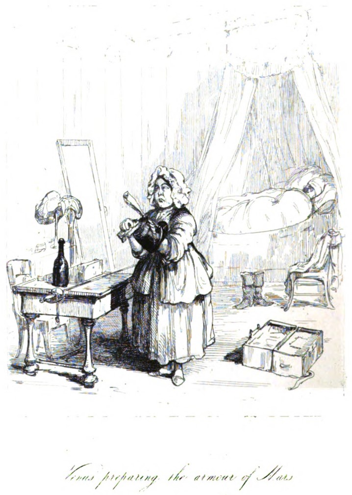 Peggy O’Dowd stands in her bedroom, brushing her husband’s cap. His sword lies on the table in front of her, along with a bottle and a large mirror. She has already packed his travelling-valise, which lies open on the ground next to her. Major O’Dowd himself is sleeping in the background, with his boots next to the bed and his coat thrown over a chair. Below the illustration is printed in cursive its title, Venus preparing the armour of Mars.